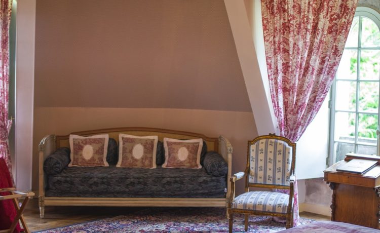 A romantic 40 m2 double room with king size bed or twin beds situated in one of the 4th round tower on the second floor of the castle, reached by a staircase leading through the castle’sitting room . 2 round windows offers a view on the park planted with famous old trees . An elegant pink fabric covers the walls.A sofa can be used for a child’s bed. A bright adjoining bathroom is equipped with a italien shower, a bathtube and toilet.